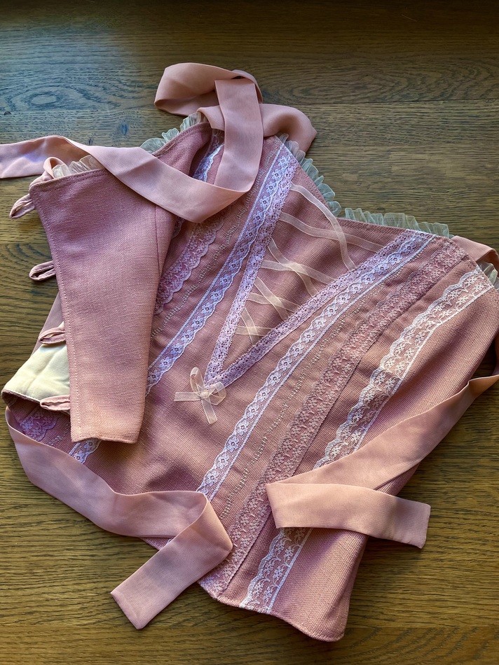 Топ-корсет на гибких корсетных косточках, декорирован кружевом, лентой и рюшей по верху. на широких бретелях-бантах, спинка на шнуровке.