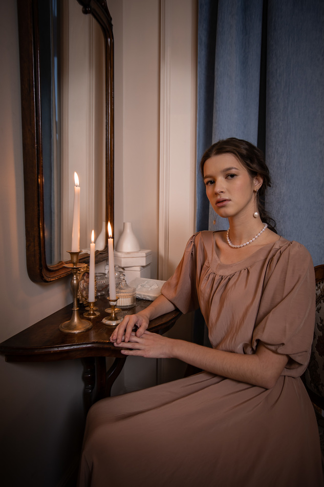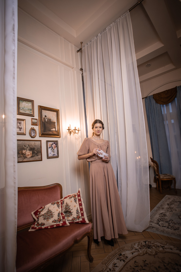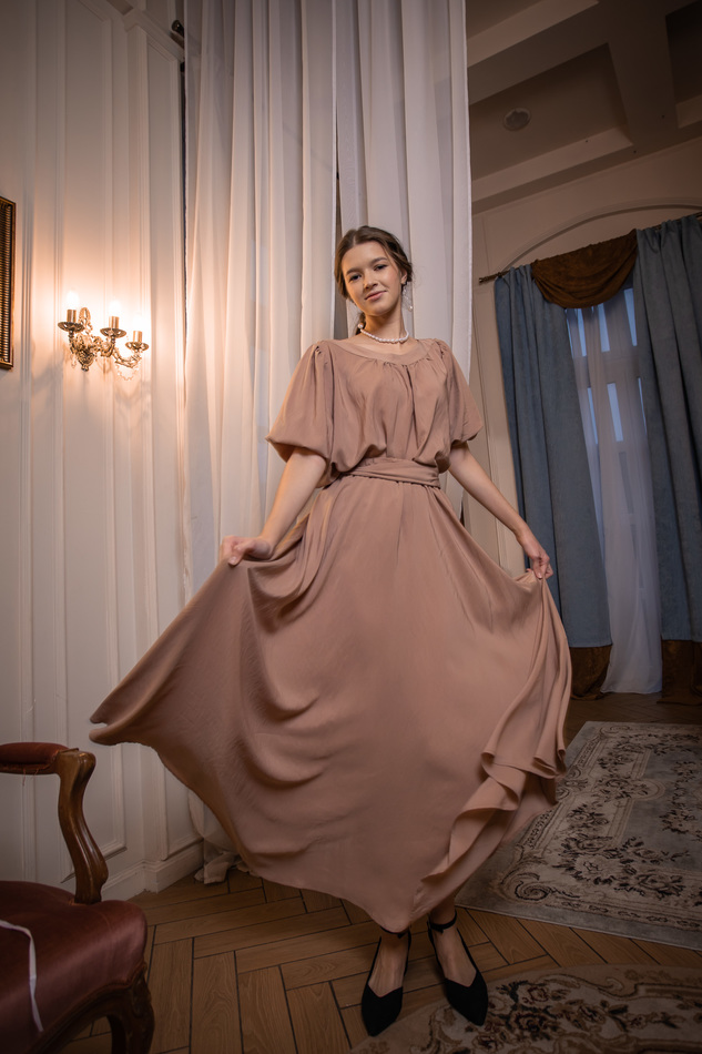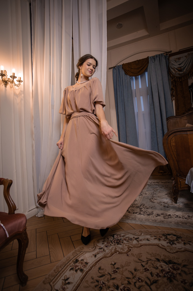 Комплект из блузки и юбки с поясом, составляющий вместе полноценное платье, при этом можно носить и по отдельности. Мягчайший струящийся тенсель(вискоза) нежного карамельного цвета. Юбочка макси хорошего расклешения верх на широкой резинке, блузка с круглым акцентным вырезом, довольно широким, пышные рукава чуть ниже локтя на резинке по низу. Широкий пояс-кушак.
