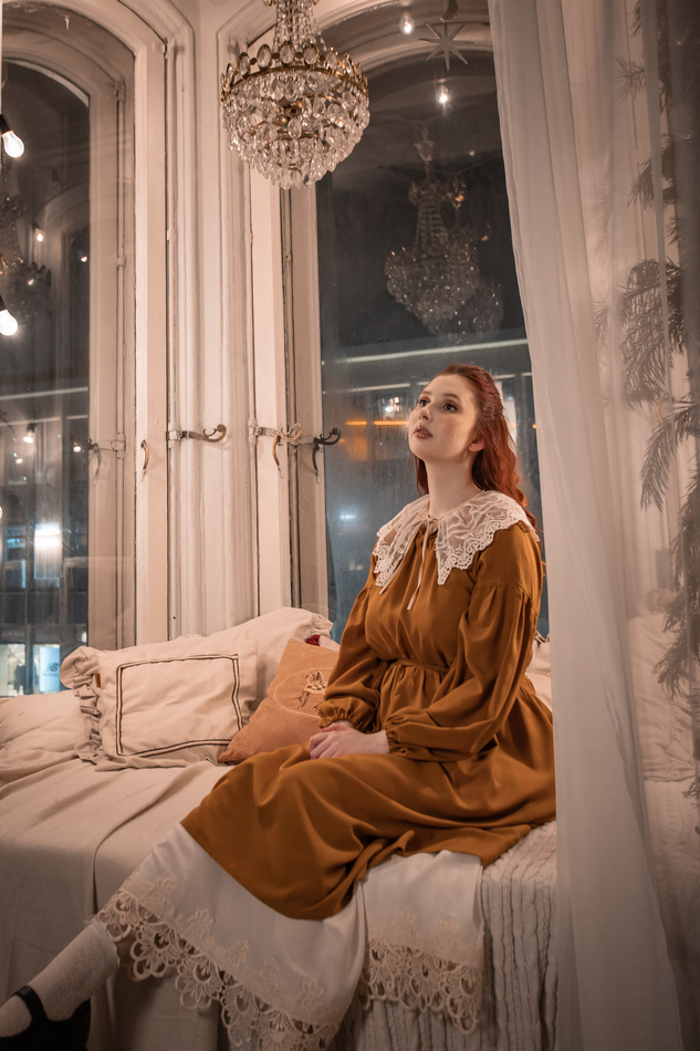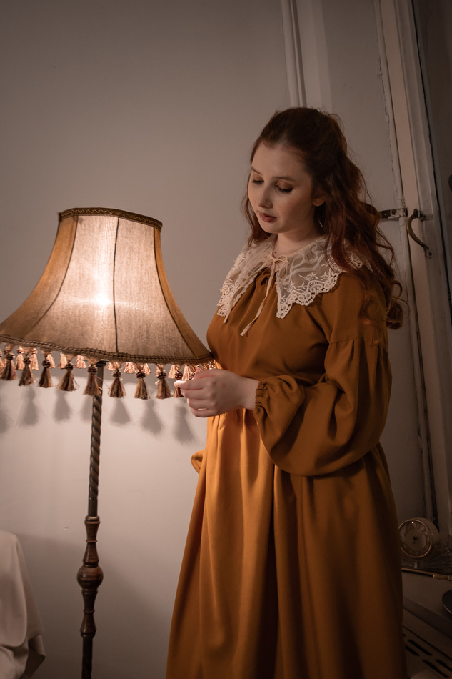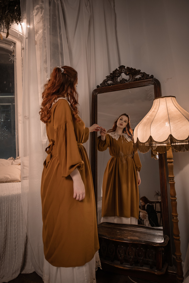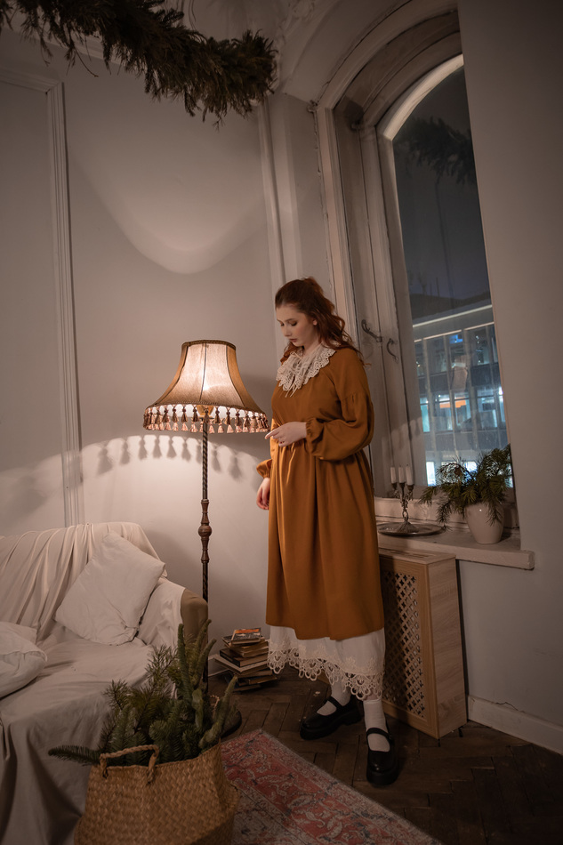 Платье из нежного вискозного штапеля сочного охристо-горчичного цаета, очень лесное, свободное, летящее, широкий рукав снизу на резинке, прилагается пояс, вырез горловины на кулиске-завязках. На обхват груди до 97см