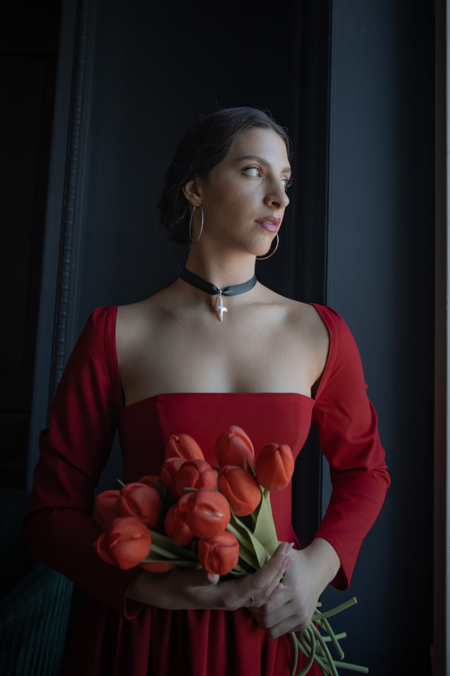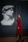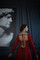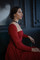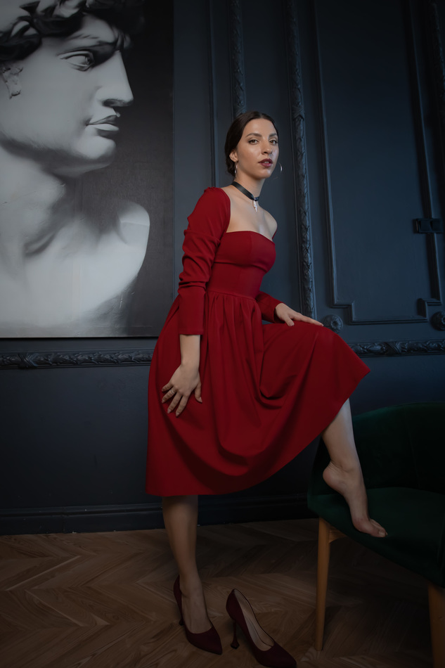 Яркое платье очень правильного красного цвета, насыщенного без посторонних оттенков. Костюмная ткань на основе вискозы с добавлением хлопка, пэ, эластана. Верх утягивается по фигуре за счет завязок на спине. Спинка открытая на корсетных косточках с контрастной лентой-шнуровкой, талия так же затягивается на спинке кулиской-завязкой. Почти квадратный вырез горловины и подчеркнуто рельефный крой лифа по аналогии с корсетом. Рукава длинные. На обхват груди до 93см.