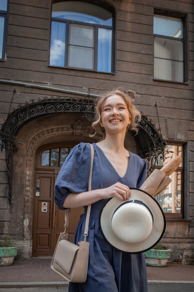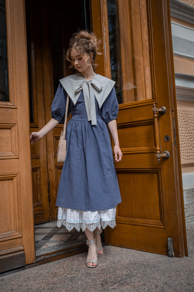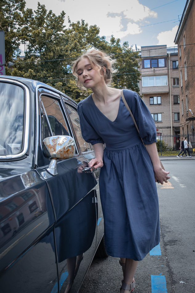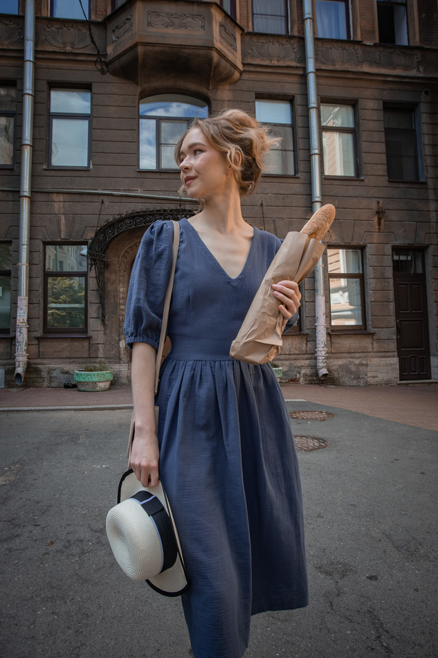Платье из натурального хлопкового двухслойного муслина серо-синего цвета. Изящный крой, платье регулируется поясом, завязывающимся сзади, v-образный вырез вытягивает рост, придает стройности, пышная юбочка создает женственный силуэт, рукава фонарики добавляют нотку романтизма. На обхват груди до 100см, длина 107см, рукава 35см.