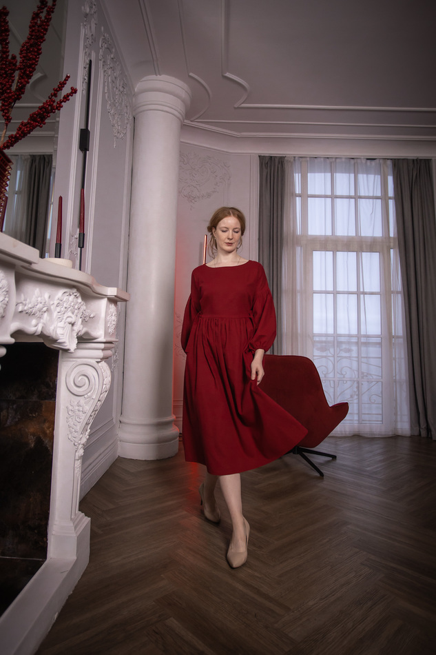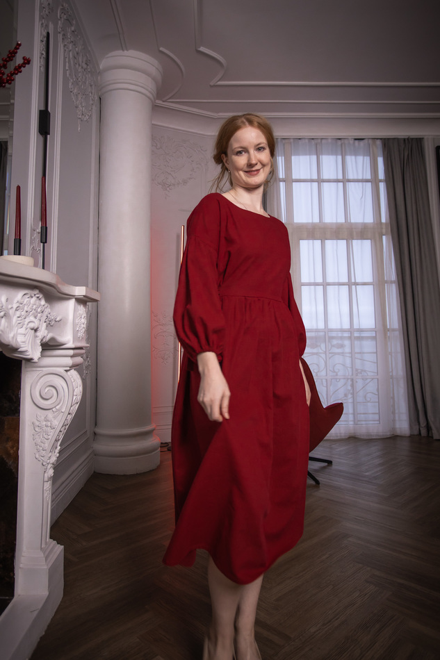 Льняное платье красивого красного цвета с пышными рукавами, вырезом лодочкой, вшитыми поясками, которые можно завязывать разными способами- по бокам, спереди или сзади. Особенно нарядно смотрится со съемными кружевными воротничками. На обхват груди до 102см, длина 112с