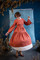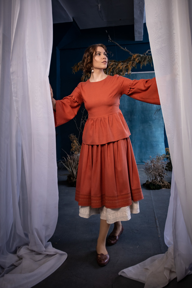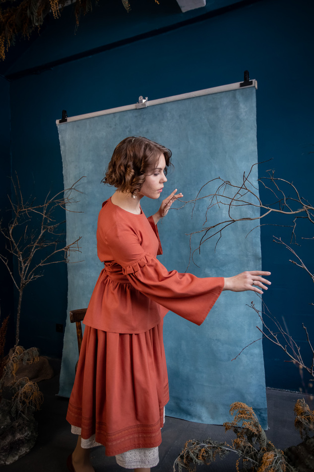 Блузка из рыжего льна, со съемным воротничком-манишкой с кружевным шитьем, широкими рукавами с оборочками на середине плеча и шнуровкой на спинке.На обхват груди до 100см, длина 60см, ширина спины 38см, длина рукава 57см.