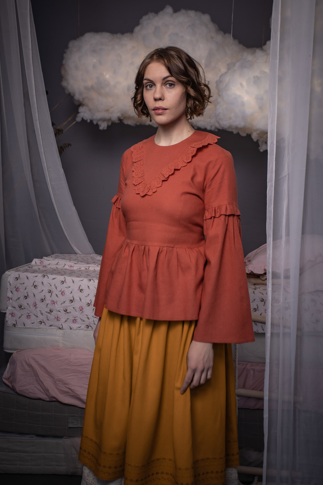Блузка из рыжего льна со шнуровкой
