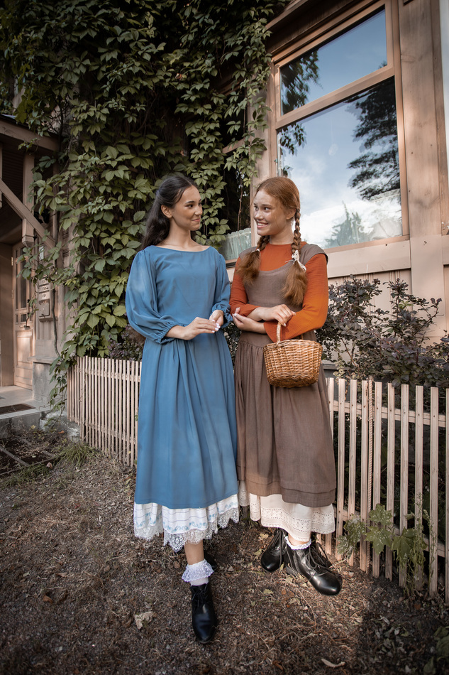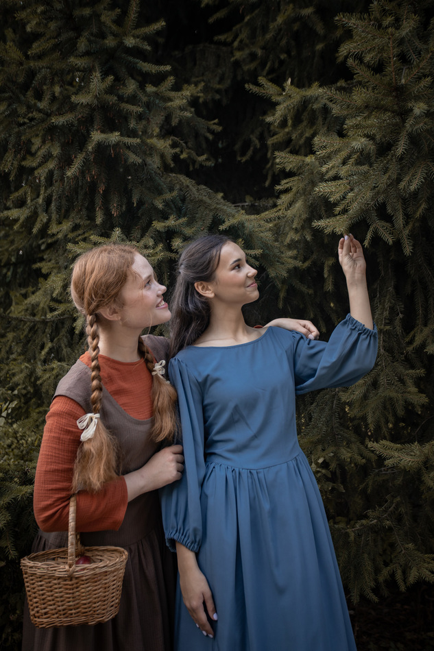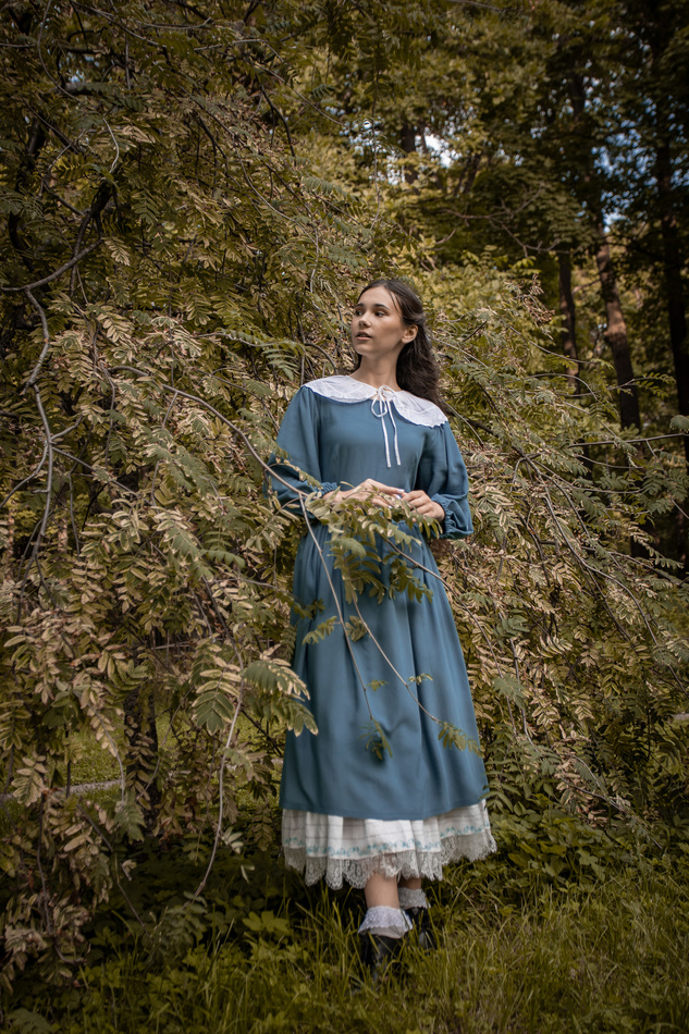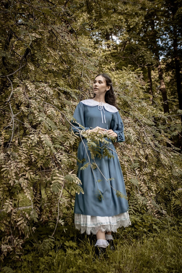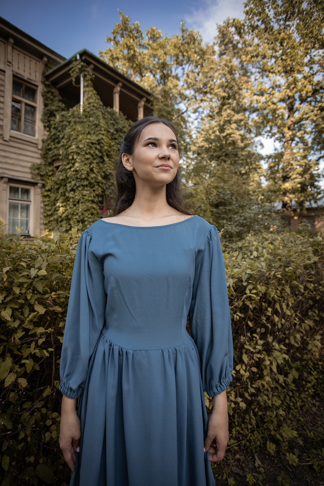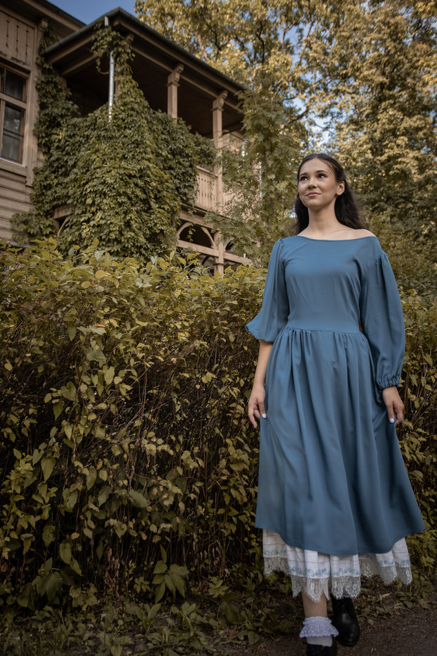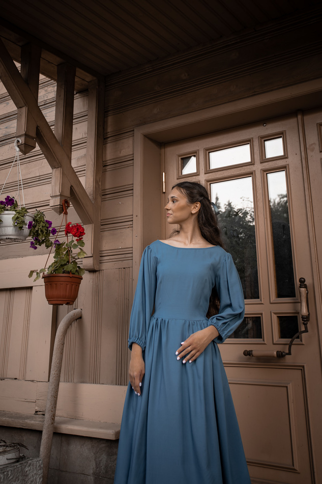 Платье из нежного струящегося штапеля голубого цвета. Вырез лодочкой, широкие рукава, размер регулируется шнуровкой на спинке.