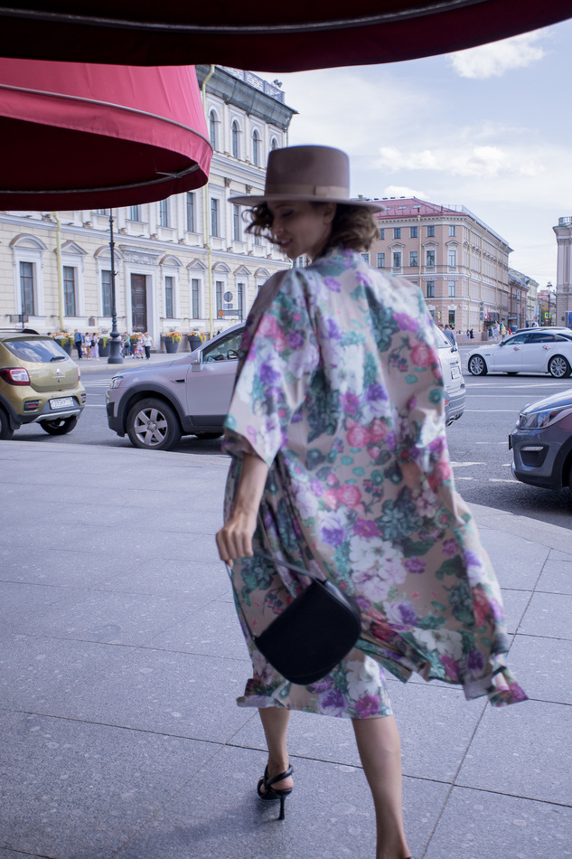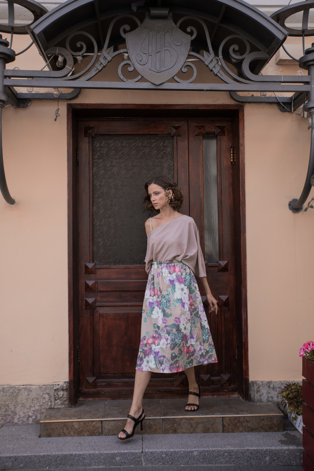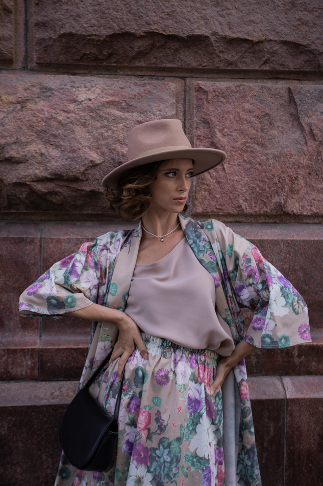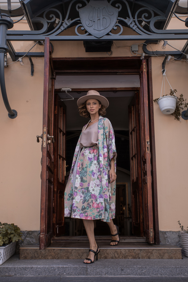 Костюм из юбки и кимоно с акварельным цветочным принтом. Приятная поливискоза. Можно носить по отдельности, или комплектом, можно с поясом или просто распахнутым. Юбка чуть ниже колен на двойной резинке. Рукав 3\4.