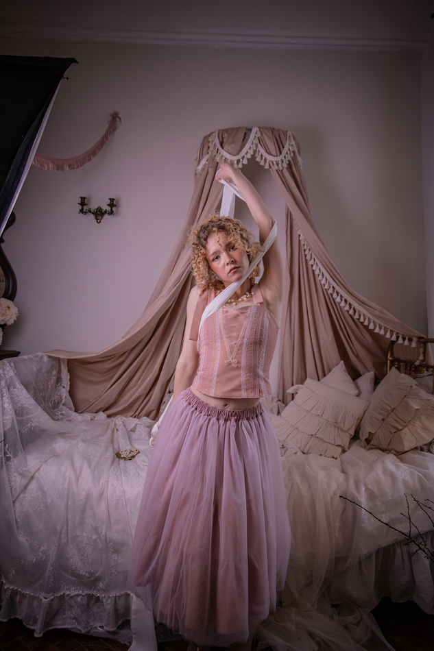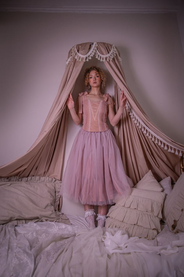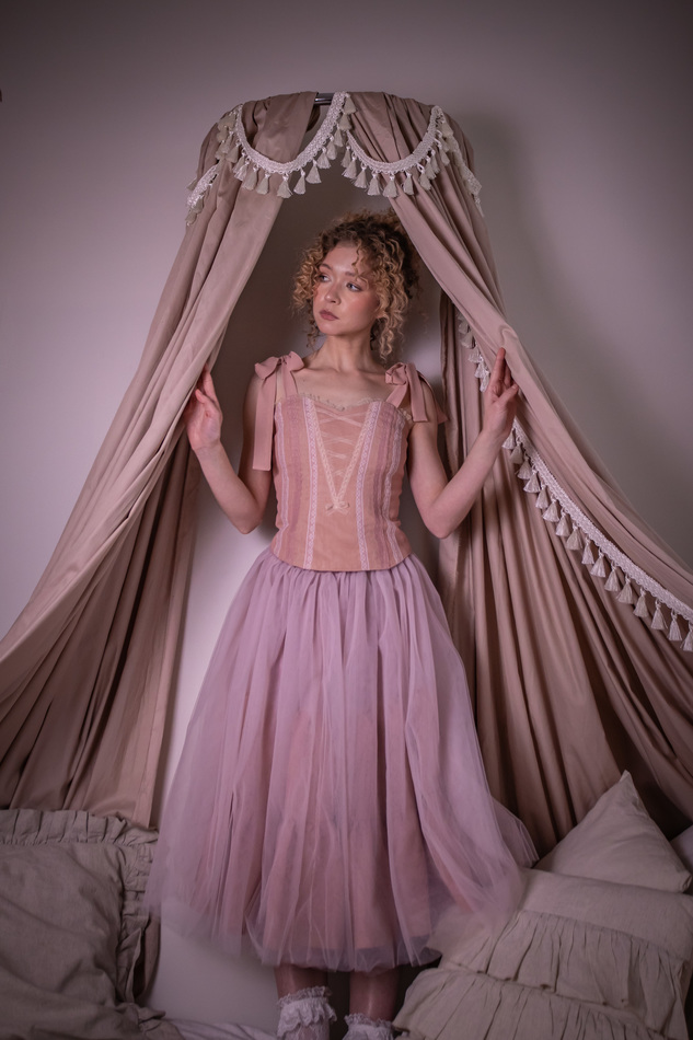 Топ-корсет на гибких корсетных косточках, декорирован кружевом, лентой и рюшей по верху. на широких бретелях-бантах, спинка на шнуровке.