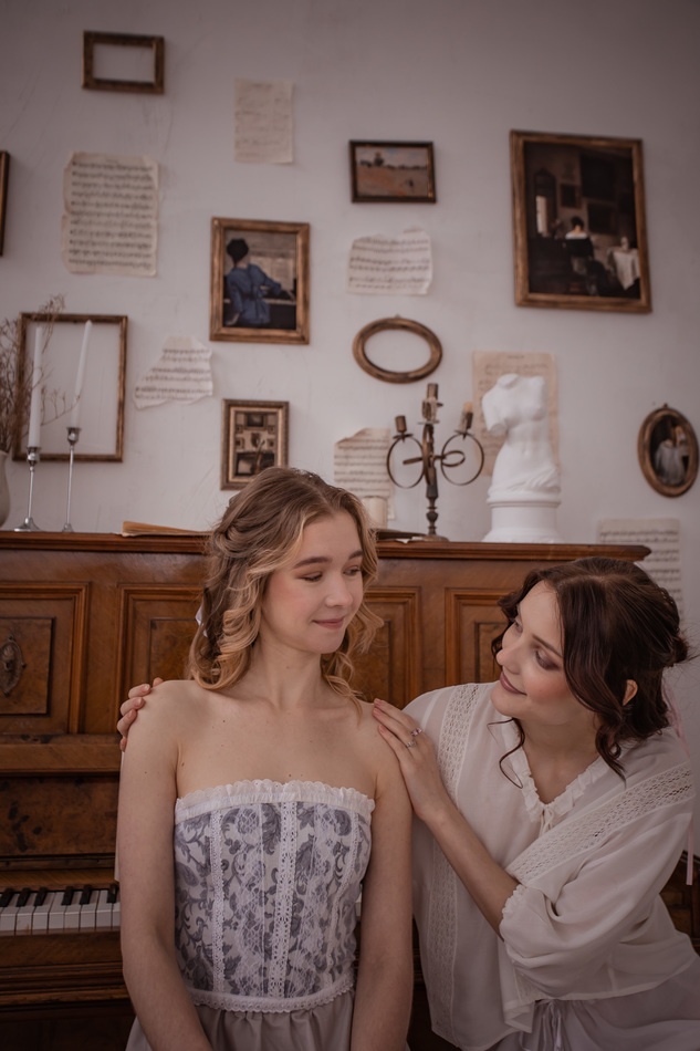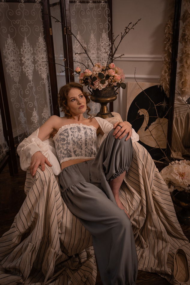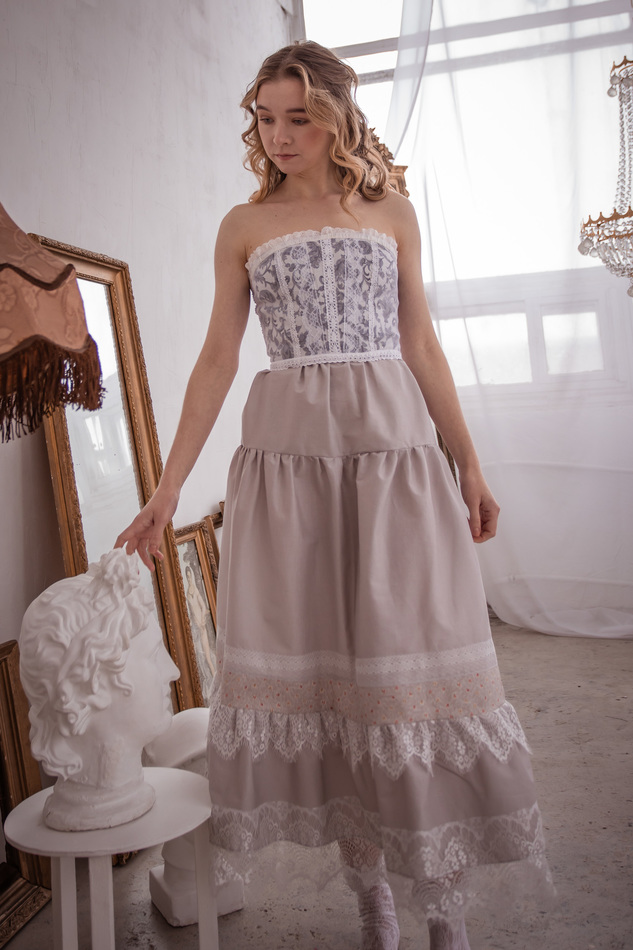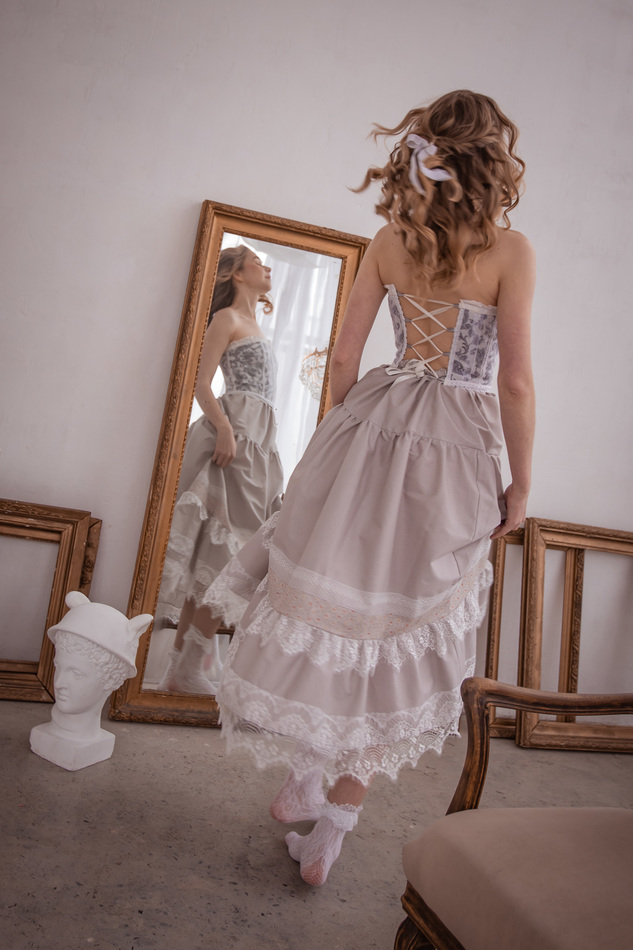Топ-корсет из жаккарда в голубых тонах с растительным рисунком, напоминающим узоры на окне. Декорирован несколькими видами кружева. Сзади на шнуровке. Будет интересно смотреться и как дополнение образа на рубашку или блузку, выгодно подчеркивая фигуру. На обхват груди 85-95см, длина(высота) 23см.