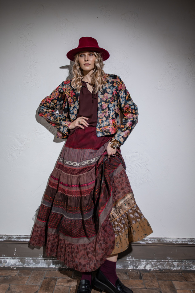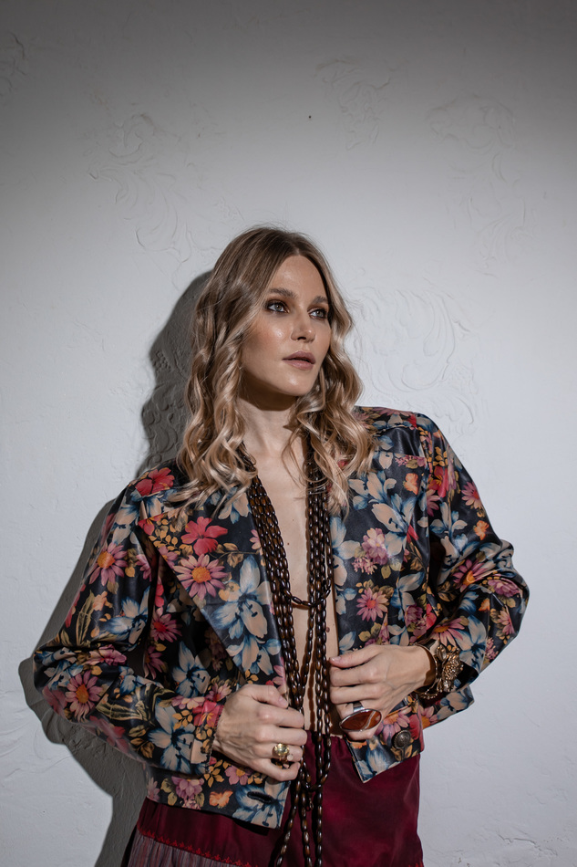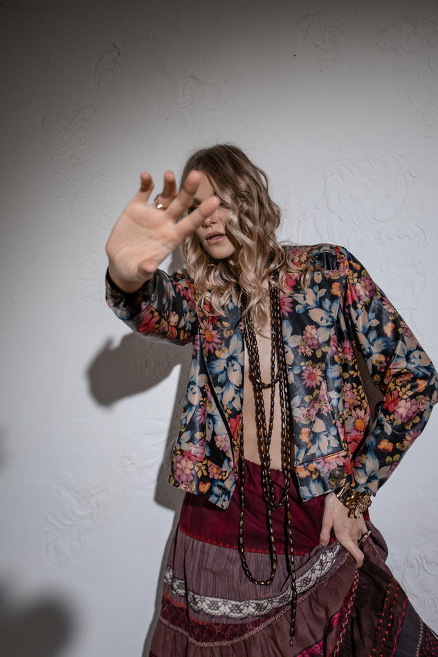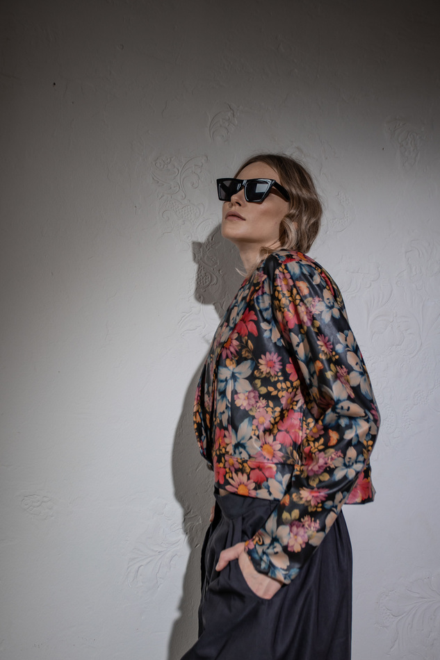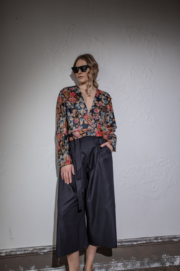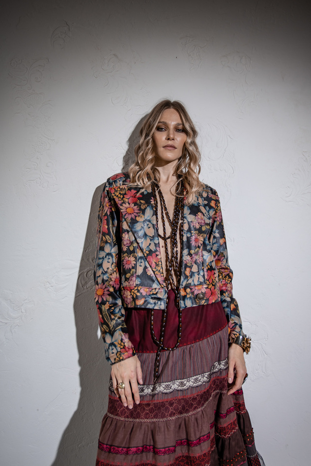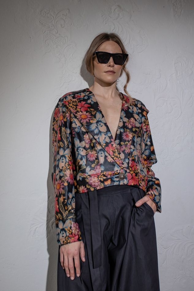 Куртка из искусственной кожи с цветочным принтом. Свободный крой, Без воротника, но в широкими лацканами, застежка на пуговицу на поясе по линии заниженной талии. Размер универсальный 40-48