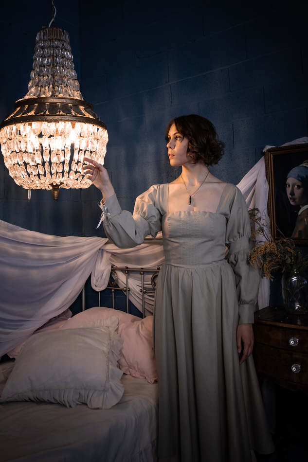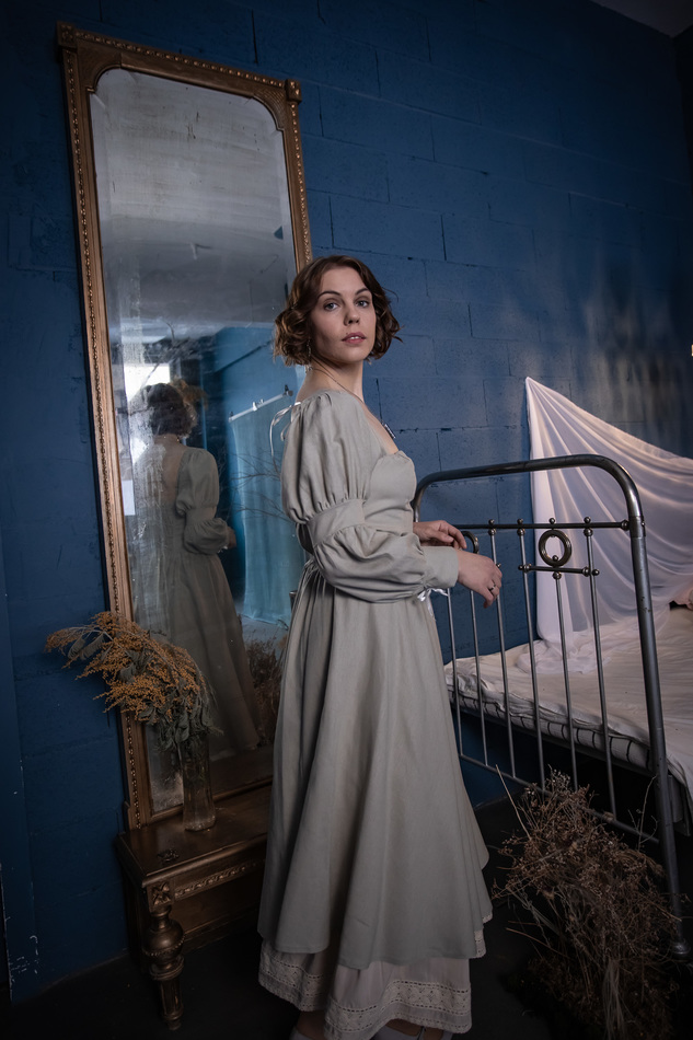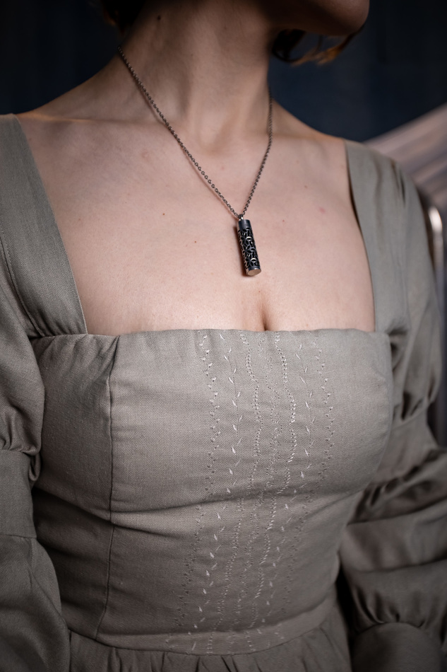 Платье из светло-светло-зеленого льна принцессного кроя. Оригинальная форма рукава с пышными фонариками снизу на манжете на шнуровке, квадратный вырез, вышивка по лифу, спинка на шнуровке с корсетными косточками, мягко-расклешенная юбка по косой. На обхват груди до 104см, длина 115см.