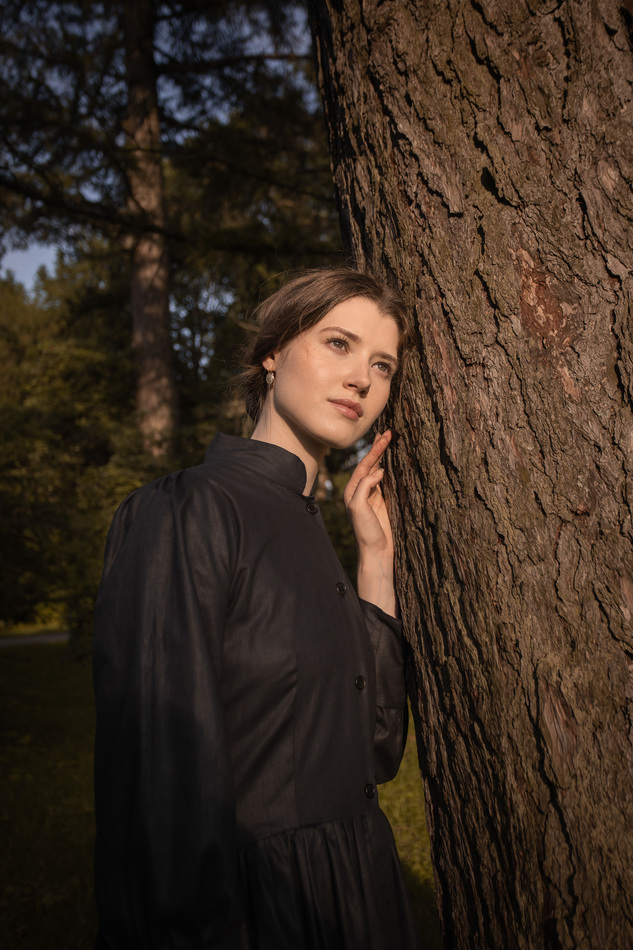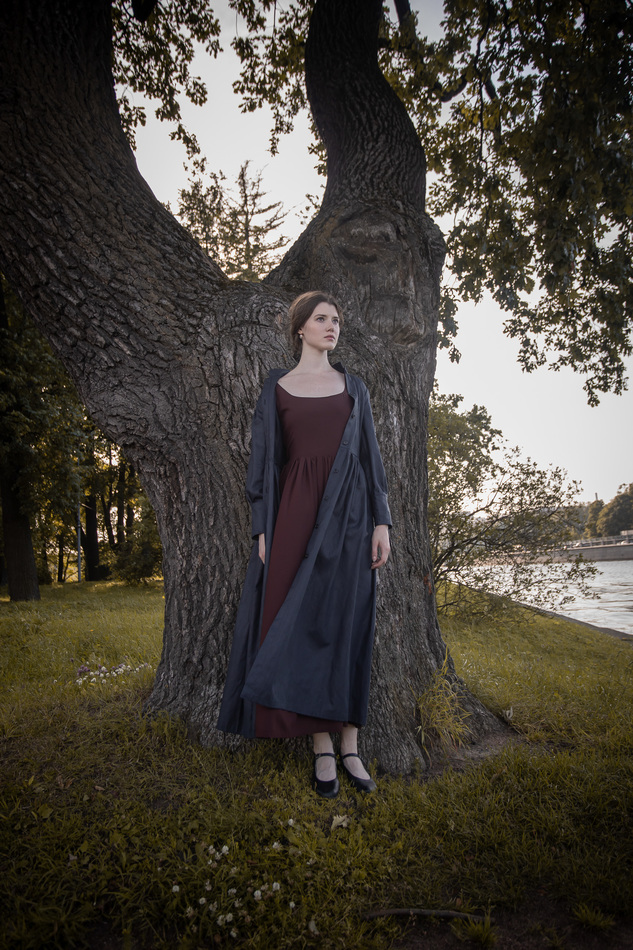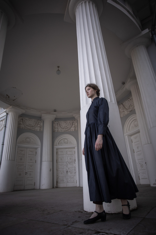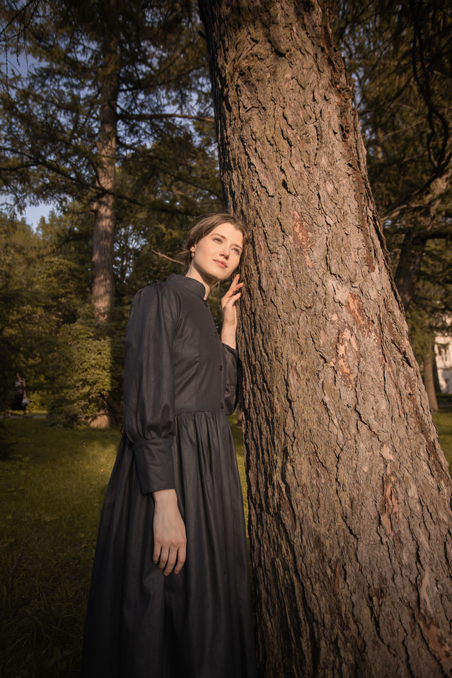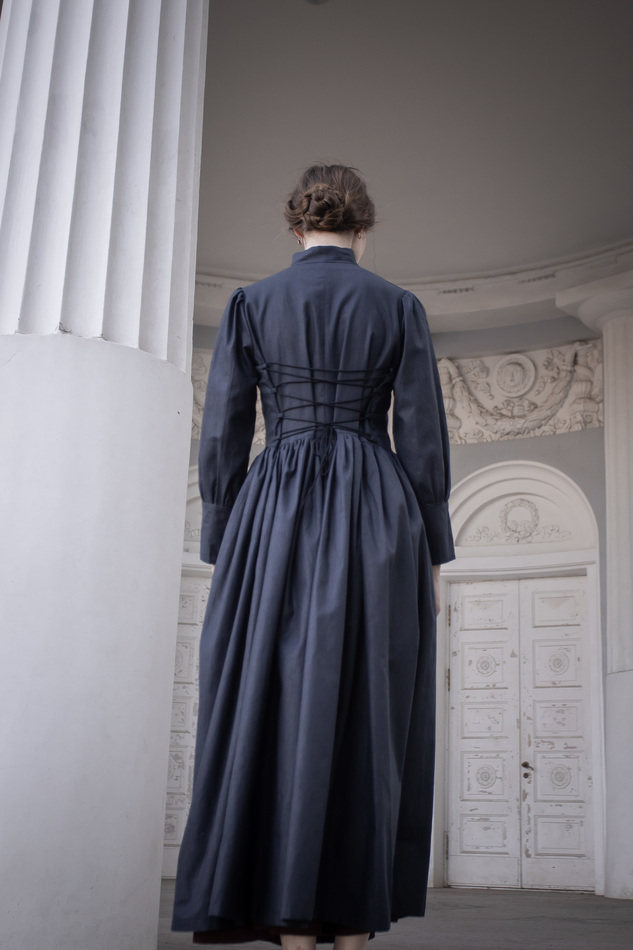 Плащ-пальто-или платье из черного льна. Воротник-стойка, застежка на пуговицы по всей длине, пышные рукава с широкими манжетами, очень расклешенное, шнуровкой на спинке регулируется размер и посадка. Очень классическая, многофункциональная и женственная вещь. На обхват груди до 110см, длина спинки до талии 40см,ширина спинки 38см, длина рукава 58см