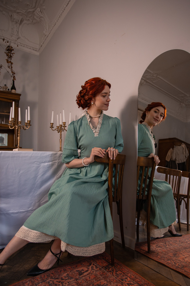 Нежно-бирюзовое платье с кружевным v-образным вырезом