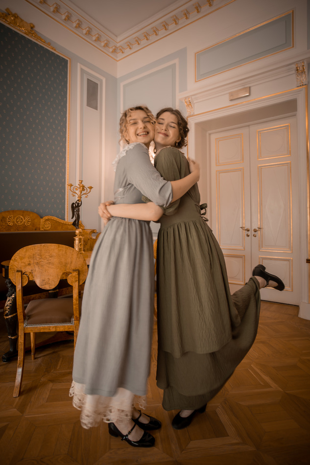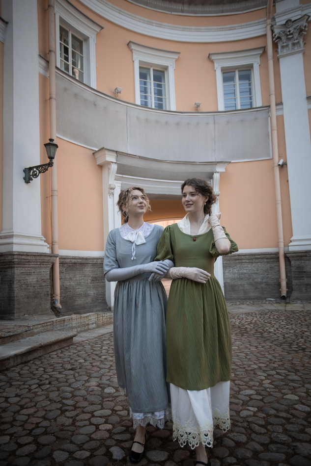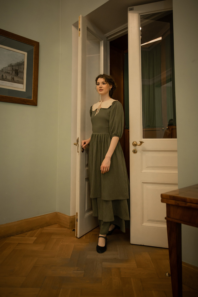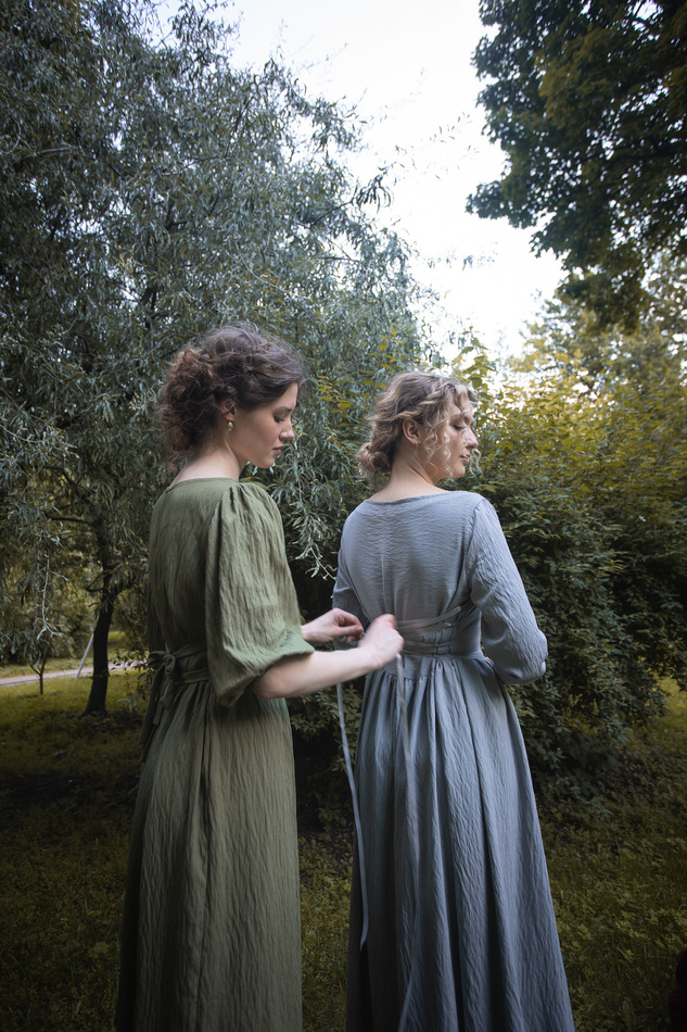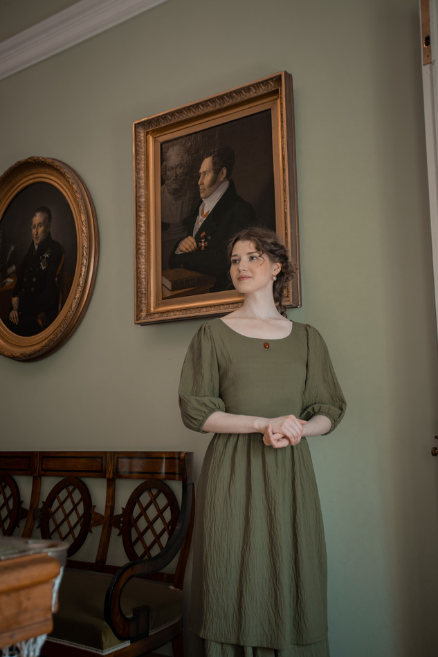 Романтичное платье из фактурной вискозы с жатым (крэш) эффектом за счет небольшого содержания нейлона зеленого цвета оттенка июльской травы. Широкий вырез горловины, рукавчики по локоть, длина чцть ниже колен, можно удлинить юбкой из той же ткани (как на фото), или добавить на любую желаемую длину ярус(под заказ), приталенный силуэт формируется 2 поясами, завязывающимися на спинке. На обхват груди до 95см, длина ок 100см, длина спинки до талии 39см