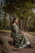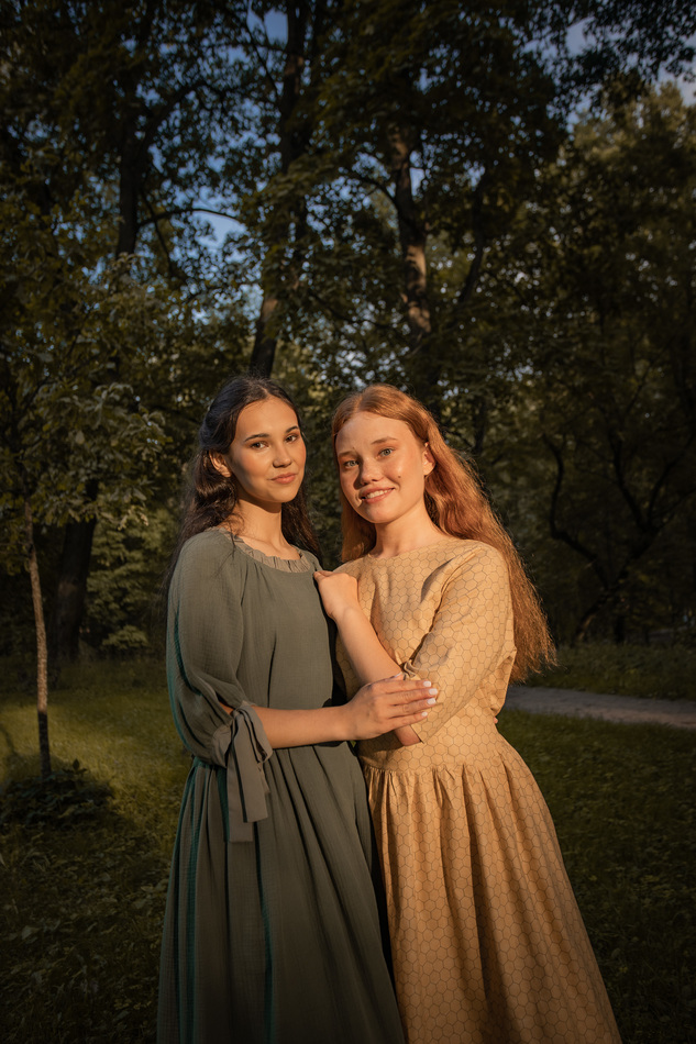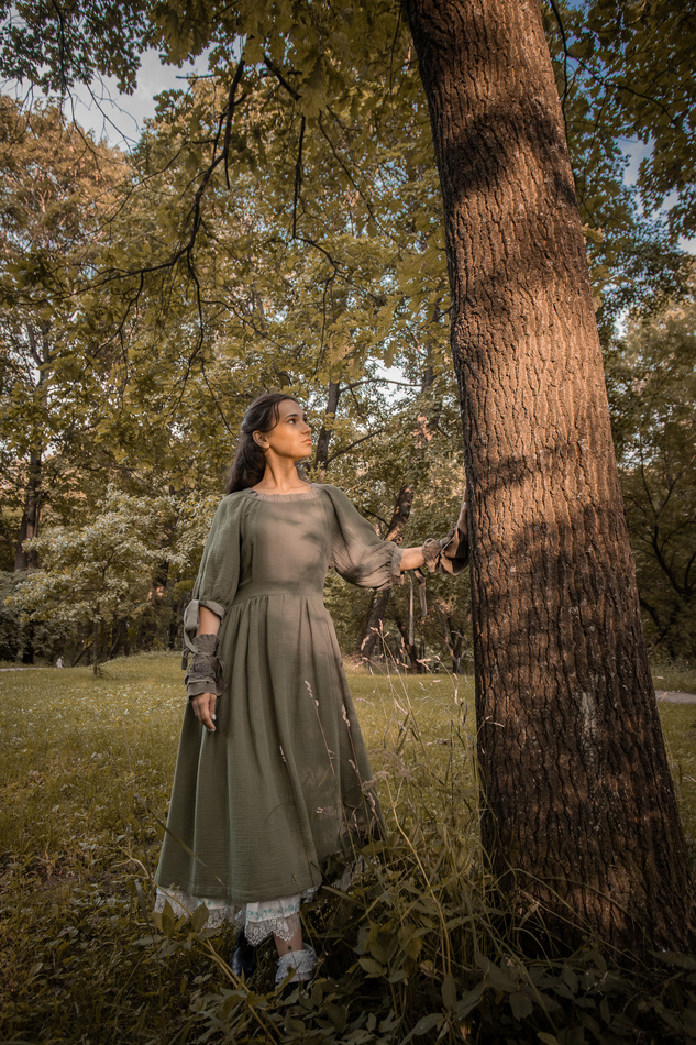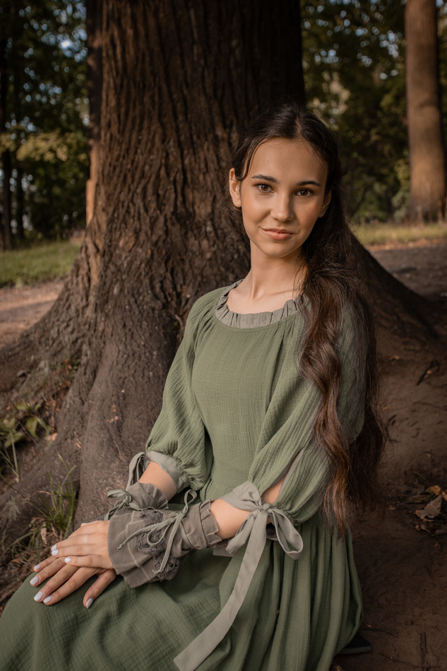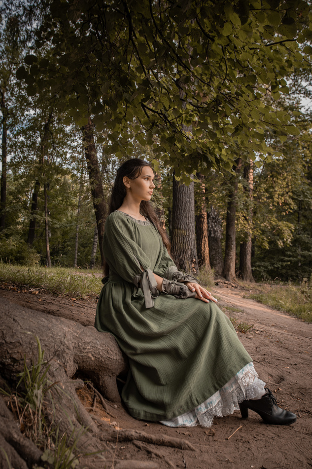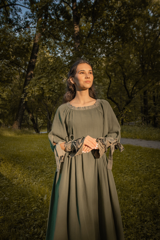 Платье из нежного муслина с отделкой из тенселя оборочкой по вырезу и бантиками-манжетами на рукавах, талия регулируется поясом сзади. Пышное, рукав ниже локтя. На обхват груди до 95см
