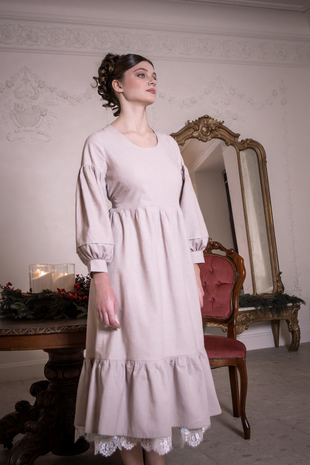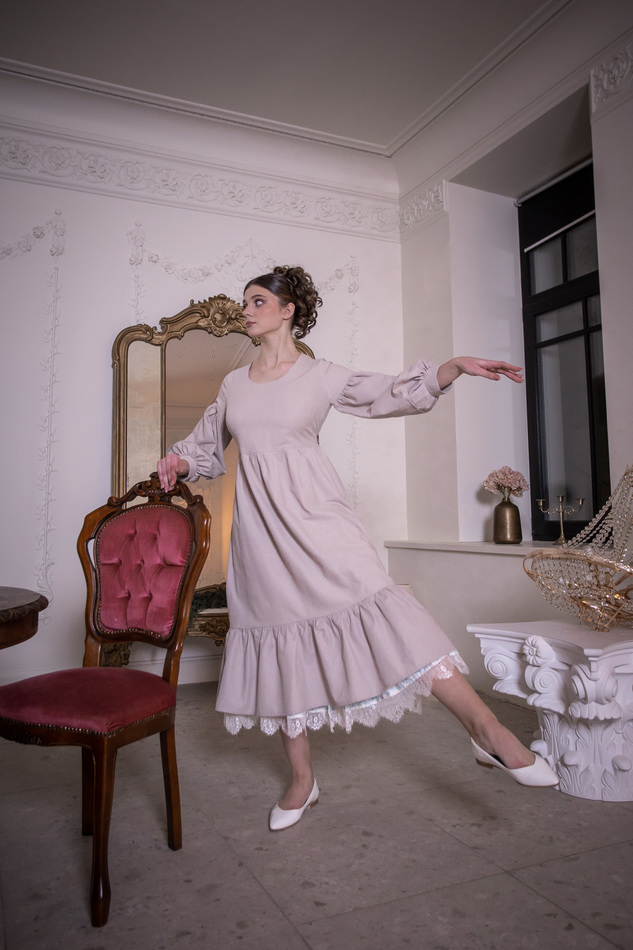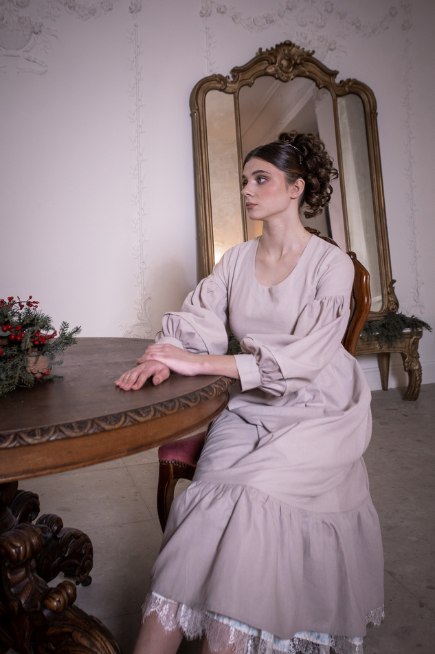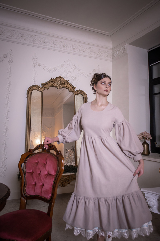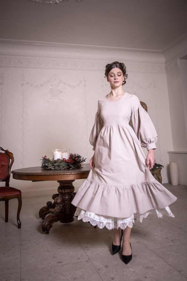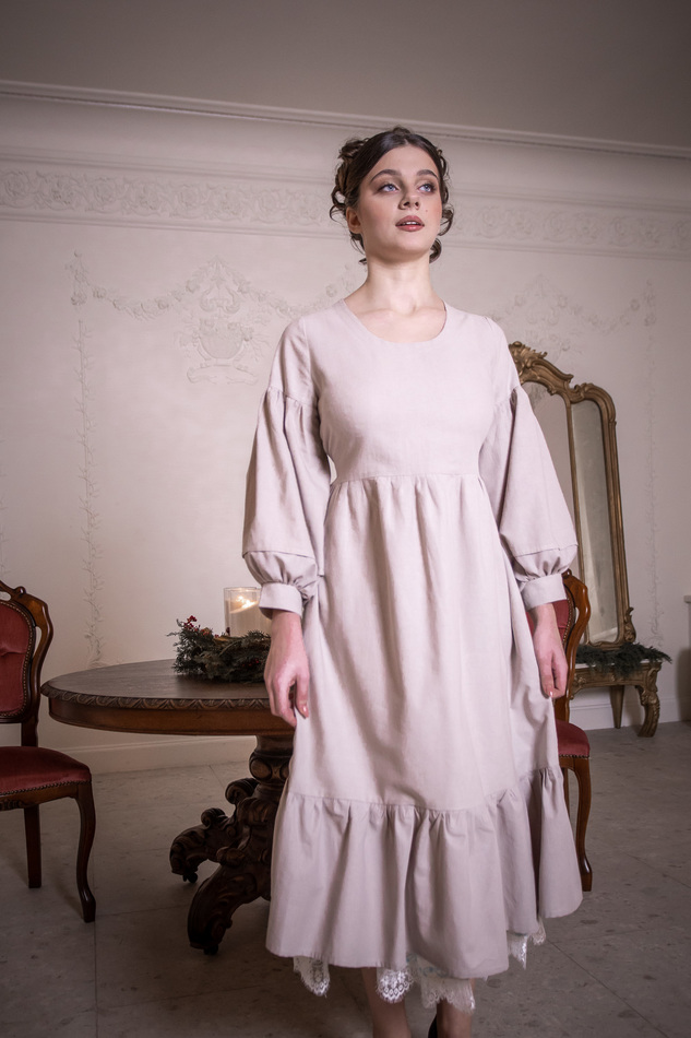 Платье из светло-серо-бежевого льна с пышными рукавами