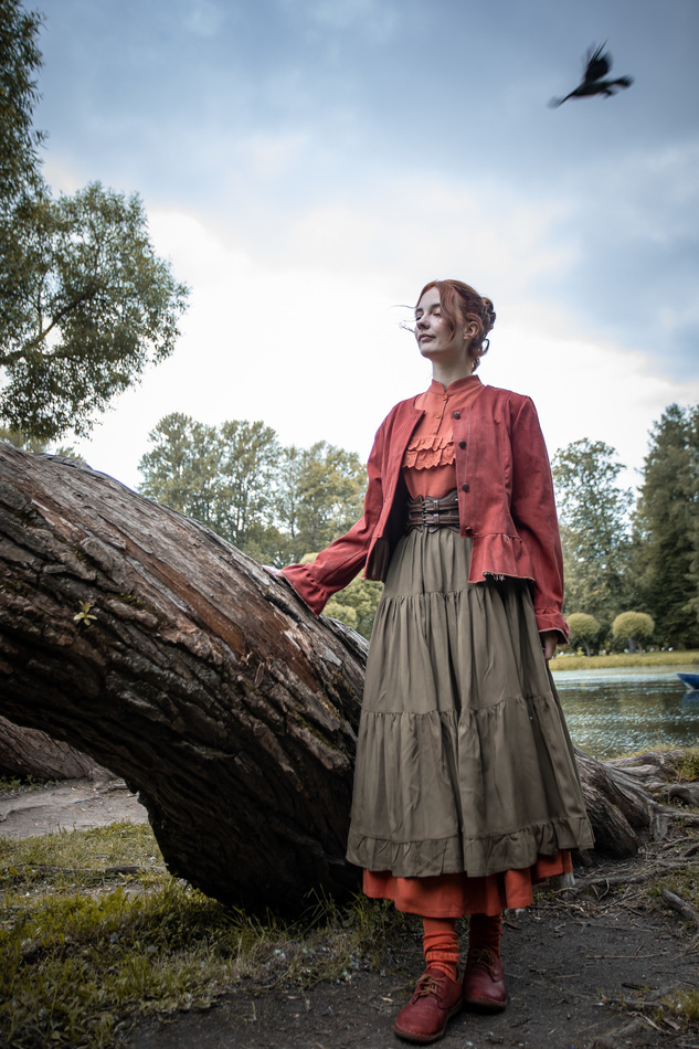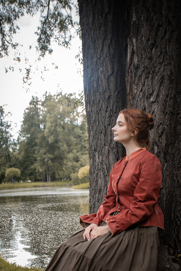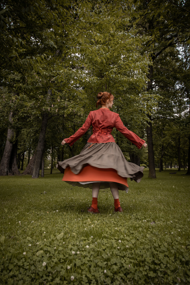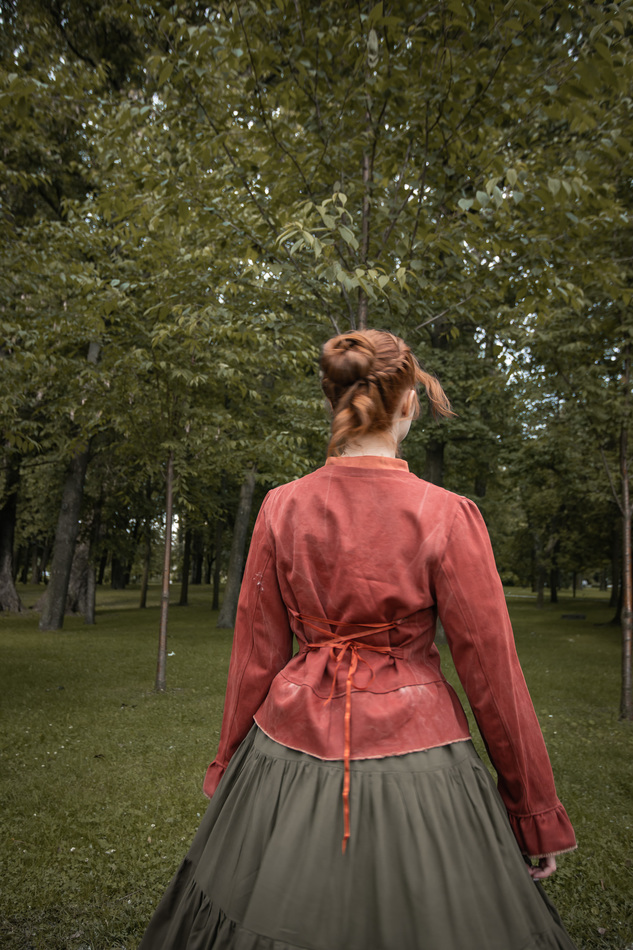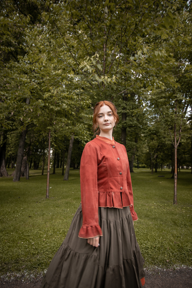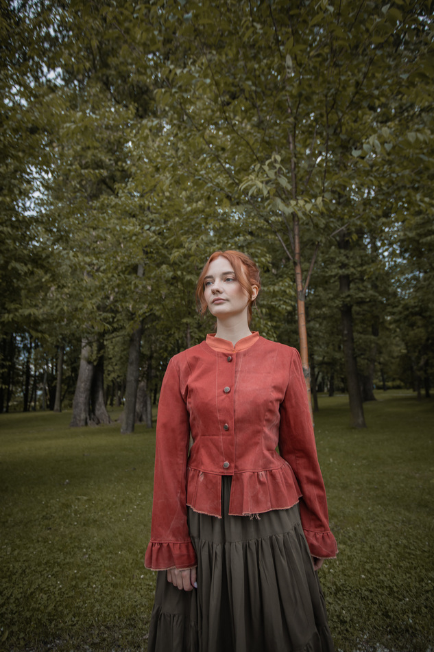 Жакет из плотного хлопка (аналог джинсы) очень вкусного терракотового цвета. Без воротника, по низу рукава манжет-оборка, а на самом жакете оборка - баска. Винтажные пуговки добавляют вайба, а шнуровка на спине позволяет идеально регулировать размер. На 40-46р