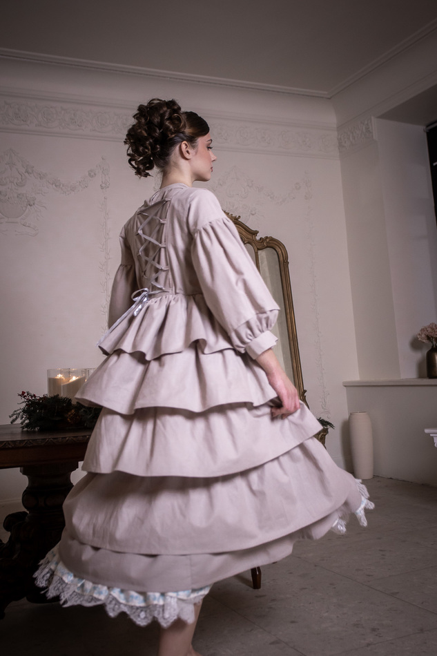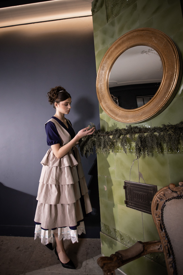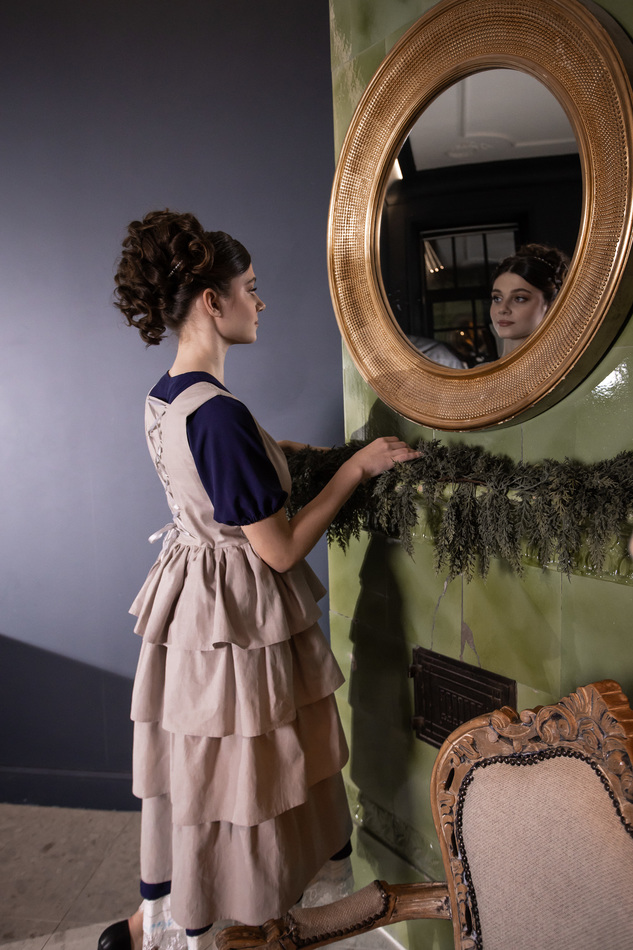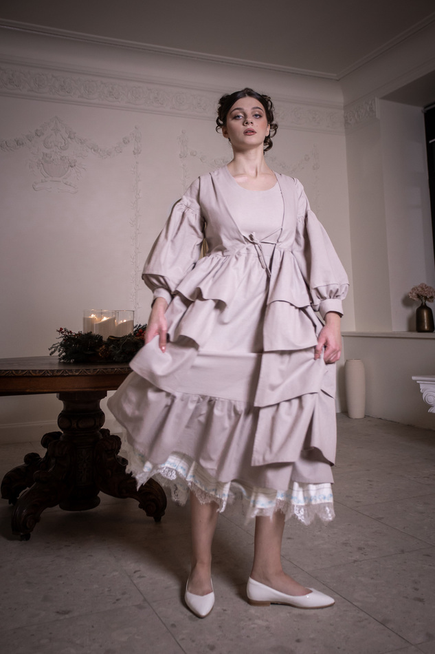 Оригинальный аксессуар из натурального светлого льна серо-бежевого оттенка. Жилет с v-образным вырезом на кулисках-завязках со шнуровкой на спине и с распашной пышной "юбочкой" с многослойными оборками. Цельно выглядит с платьем из того же материала, но и с контрастным тоже хорошо. Размер регулируется кулисками и шнуровкой на спинке. На обхват груди 80-100см, длина 112с